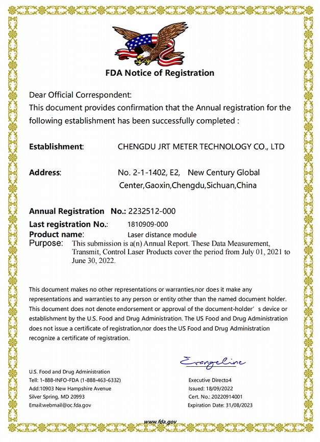 景瑞特激光测距传感器已出口到全球100多个国家,我们的激光传感器有各种认证,包括但不仅有CE, FDA, 激光安全等级测试证书等等: